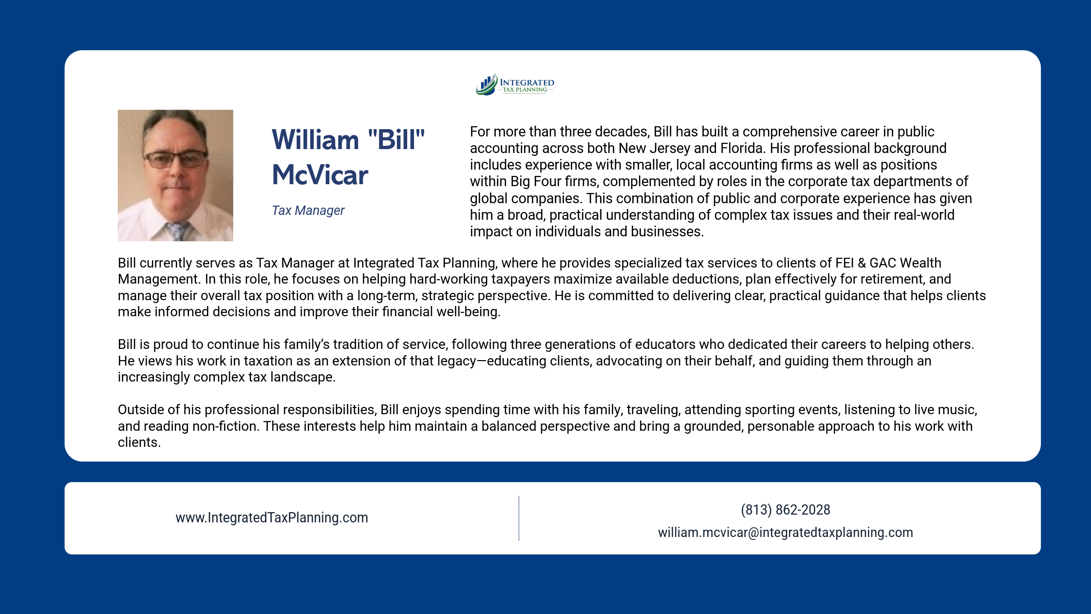 It is not a requirement of our firm that you work with Bill or Integrated Tax Planning, you are always free to continue using your existing CPA or tax professional. Our goal is simply to provide you with an additional, trusted resource who understands your financial picture and can help streamline your tax filing process.